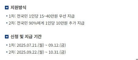 - 소득 하위 90% 이하: 1차 15만 원 + 2차 10만 원 = 총 25만 원 지급